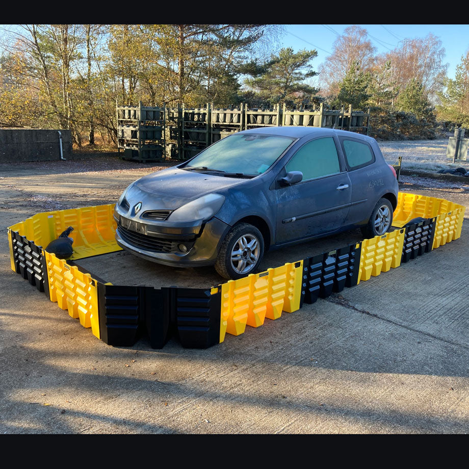 The QuarantineFence Lightweight solution is a steel structure engineered to confine hazardous events like lithium battery fires or damaged electric vehicles. Its water-tight construction, facilitated by gasket sealing when fully enclosed, allows the internal structure to be flooded, serving as a control or suppression method.