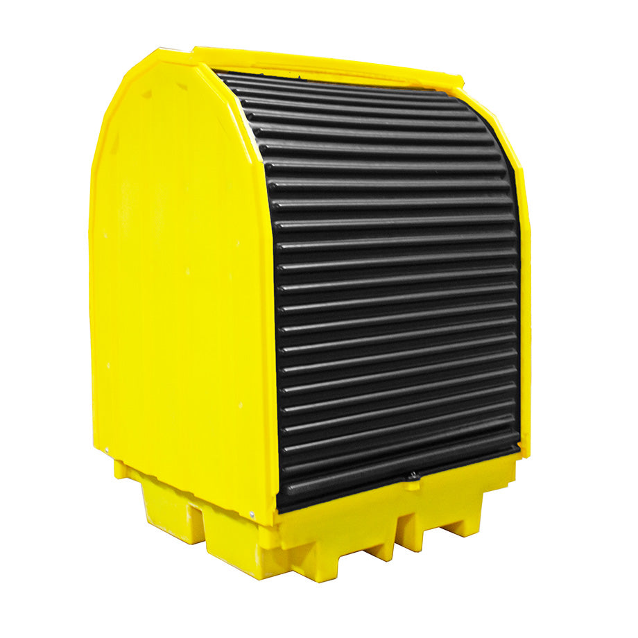 This hard cover spill pallet is equipped with a roller-top door designed to prevent rainwater and dirt from contaminating the drums and sump. The doors are equipped with an eye bolt locking system (padlock not included).